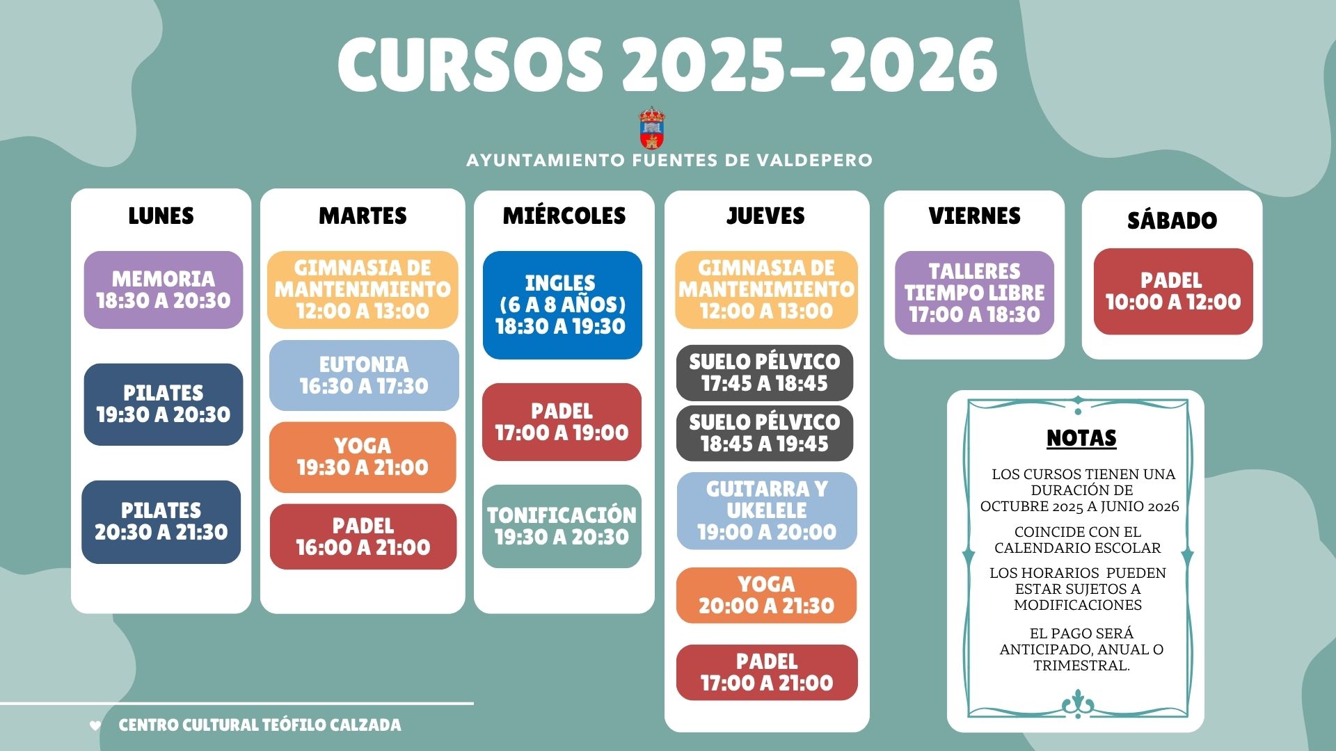 A continuación encontrarás las actividades que se impartirán en el Centro Cultural Teófilo Calzada durante el curso 25/26.
